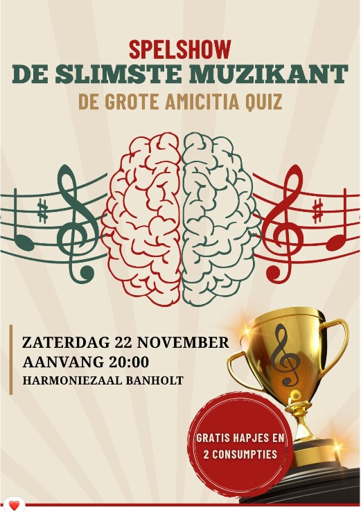 Een hoogtepunt van de avond was de quiz ‘De Slimste Muzikant’. Roger Flamand nam hierbij op humoristische wijze de rol van presentator Philip Freriks op zich, terwijl Huub Deckers en Pierre Fransen als duo de rol van jury vertolkten. Alle muzikanten van de vereniging namen enthousiast deel aan de quiz.
